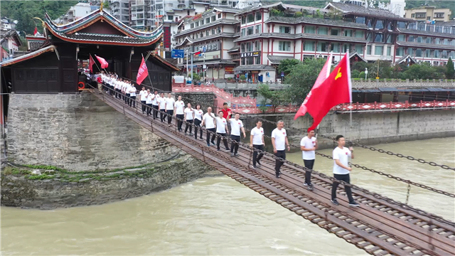 飞夺泸定桥,是红军长征路上的关键一仗,是一场比智慧、比毅力、比勇气的战斗。“挑战之旅”队伍在党旗和支线旗的引领下,行进在铁索横江的泸定桥上,一幅幅战斗画面在脑海中浮现,一声声呐喊和枪炮声犹在耳畔回荡,激发起尊龙建设集团团队干事创业、勇于挑战的工作热情。